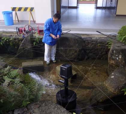 高圧洗浄機を使って、岩についた汚れを一気に洗います。