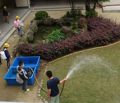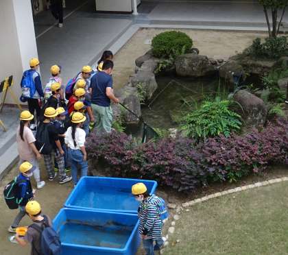 キレイになった池に、カメさんとコイさんを移します。