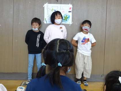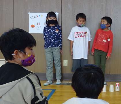 2年生が1年生に遊び方の説明をしている様子です。