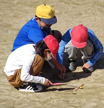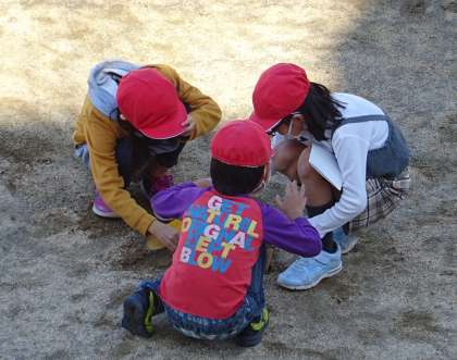 太陽の光が当たっている所と、陰になっている所の温度を調べています。