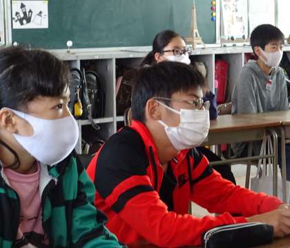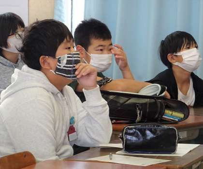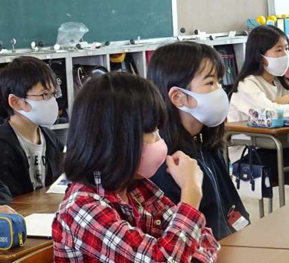 4年生が発表しているビデオ映像を、教室で見ている様子です。