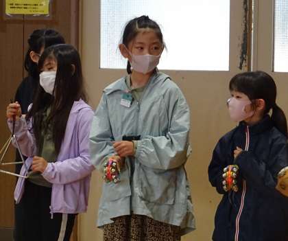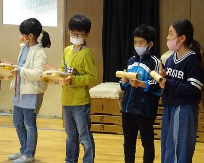 3年生と4年生が、打楽器の演奏体験をしている様子です♪