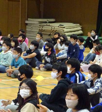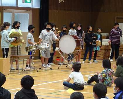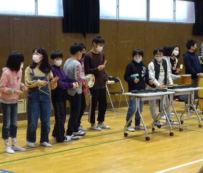 5年生と6年生が、打楽器の演奏体験をしている様子です♪