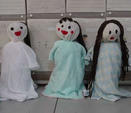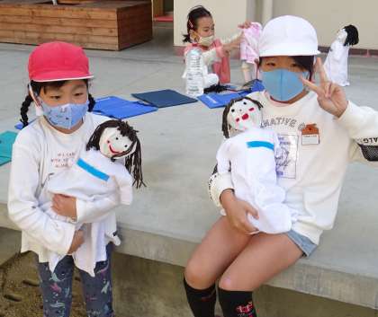 赤ちゃんをしっかりと抱っこしている2年生の子どもたち。