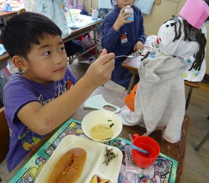 自分の給食を赤ちゃんに食べさせてあげている様子です。