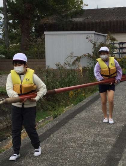 少し緊張した表情でオールを運ぶ子どもたちの様子です。