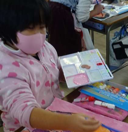 2年生が、作品展に向けて絵の具を使った作品を描いている様子です。