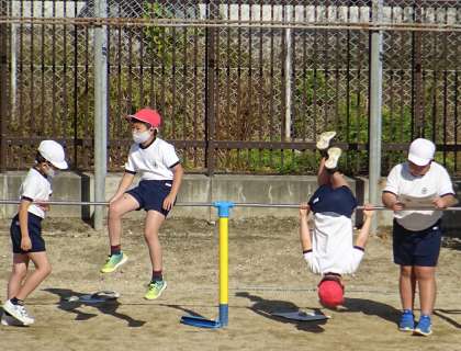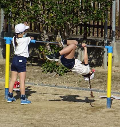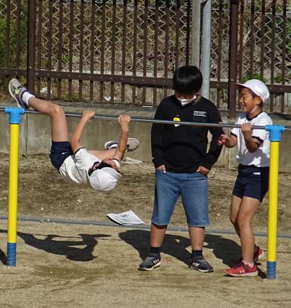 ぶら下がったままクルリと回転したり、足を鉄棒にかけたまま地面に手をついたりと、色々な技に挑戦していました。