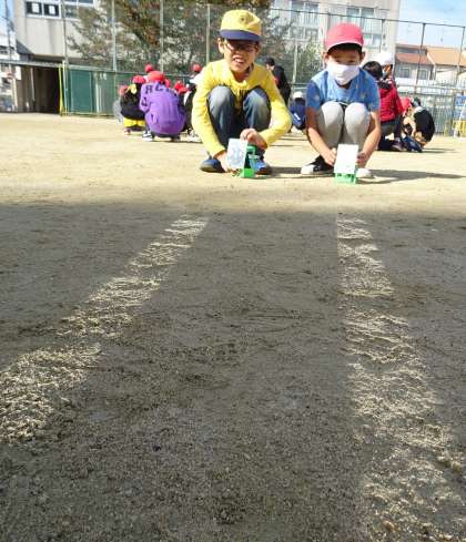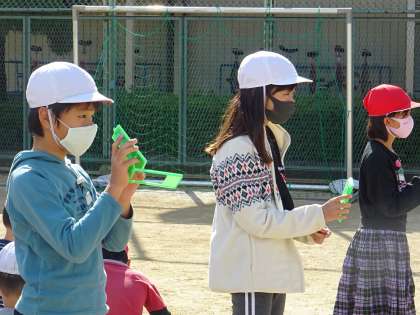 鏡で反射した太陽の光が、校舎の影にすうっと伸びます。