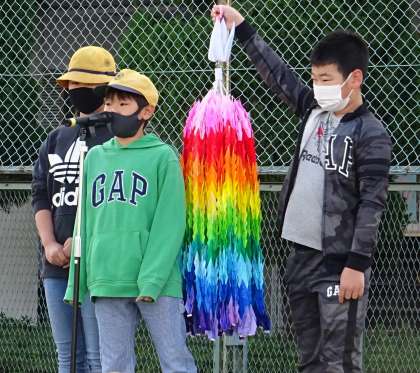 6年生からの呼びかけにより2週間にわたって取り組んだ「折り紙教室」で、二千羽以上の折り鶴が集まりました。