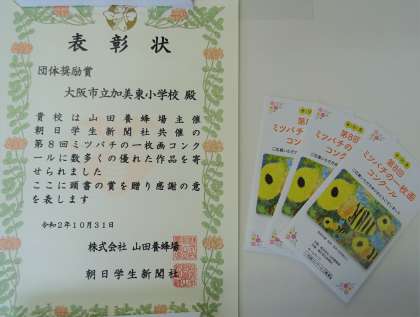 夏休みの自由課題「ミツバチの一枚画コンクール」に多くの応募があり、加美東小学校に『団体奨励賞』が送られました。