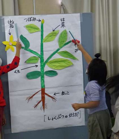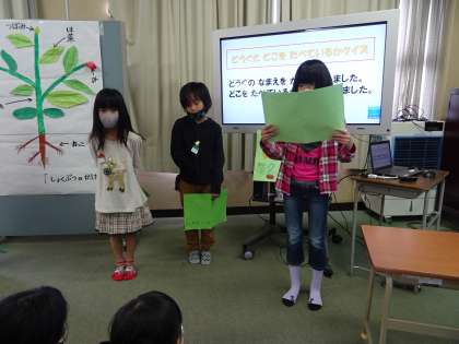 野菜を育てるときの土づくりに使う道具のクイズや、野菜のどこを食べているのかを当てるクイズです。
