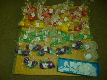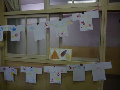 下の写真は、でき上がった「野菜の袋詰め」と「野菜スタンプを押した服の形の画用紙」です。