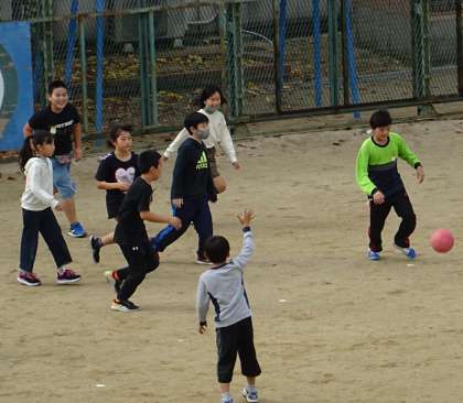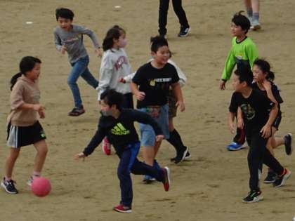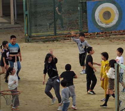 休み時間に運動場で元気よく遊ぶ子どもたちと先生の様子です。