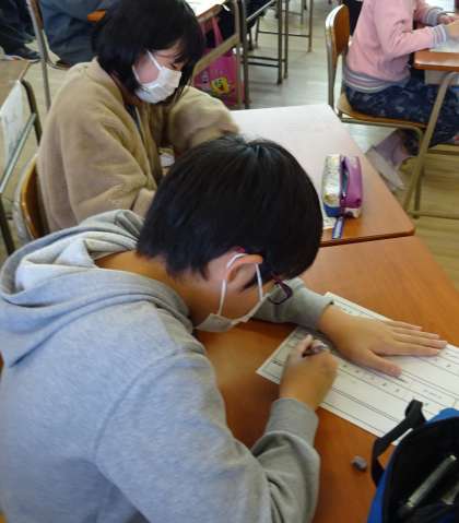 他チームのプレゼンについて、ワークシートに評価を記入している様子です。