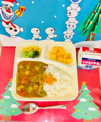 12月になりクリスマスが近づいたので、調理員さんが、星型や雪だるま型の「スペシャルラッキーにんじん」を作ってくれました。
