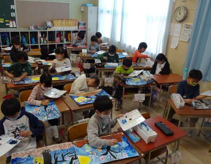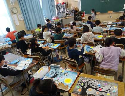 子どもたちは、思い思いの「モチモチの木」を画用紙いっぱいに描いていました。