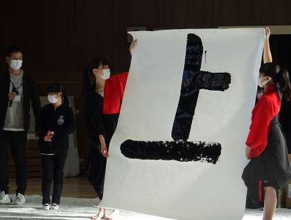 上宮高校の皆さんが来てくれたので、感謝の気持ちを込めて「上」という字を書きました。