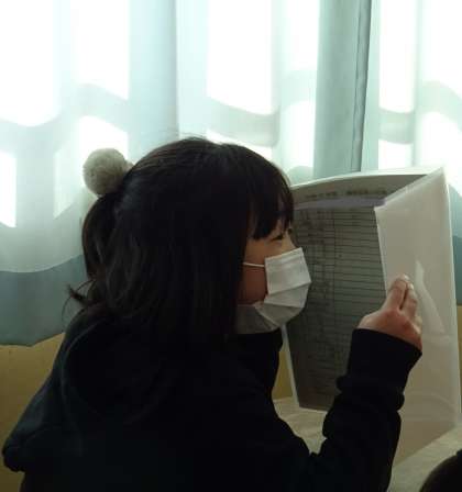 ドキドキしながら通知表を開いている様子です。