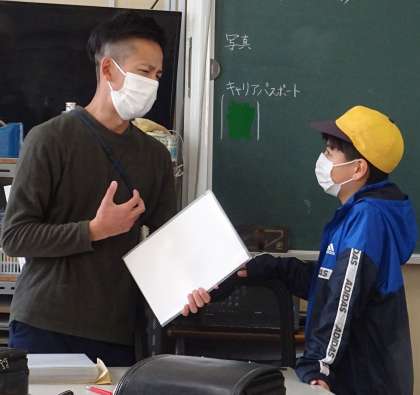 通知表を受け取っている様子です。