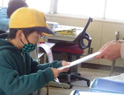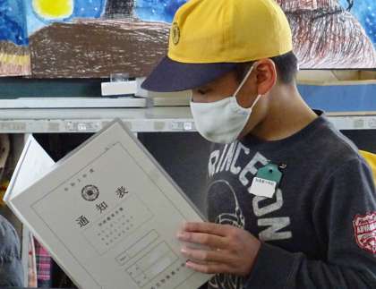 通知表を受け取っている様子です。
