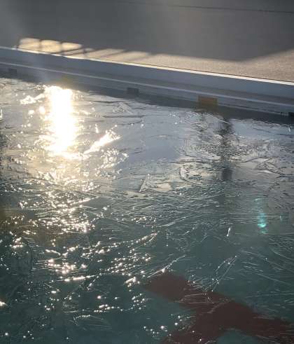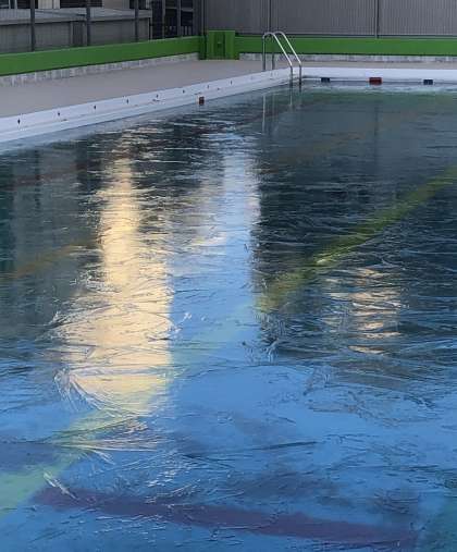 加美東小学校のレインボープールは、一面氷に覆われていました。