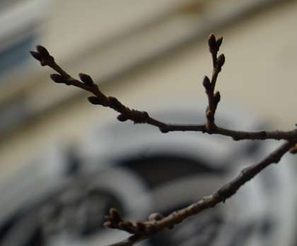 校門の桜は小さなつぼみを付け、6年生の巣立ちを祝う準備をしています。