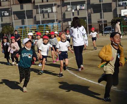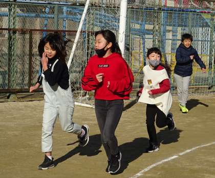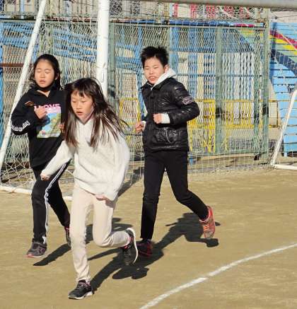 1〜3年生は内側のトラックを、4〜6年生は外側のトラックを走ります。