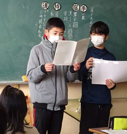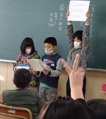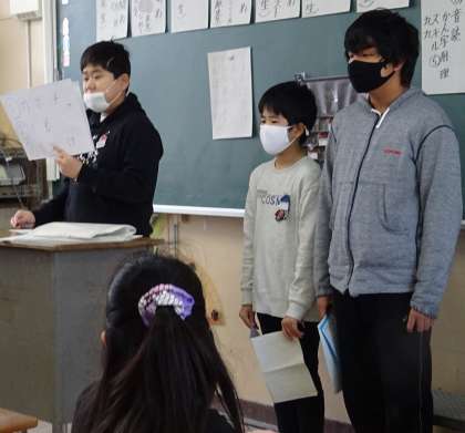 給食委員会の子どもたちが各クラスを訪問し、給食に関するクイズを行いました。