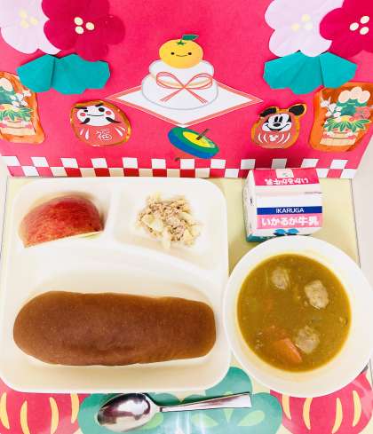ミートボールと野菜のカレー煮には、玉ねぎ、にんじん、大根などの野菜がたっぷり入っています。スープまで美味しく食べられて、体が温まる献立でした。