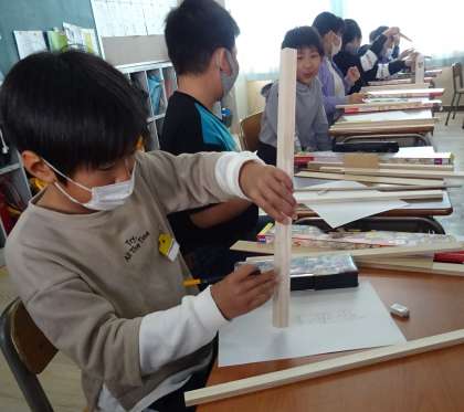 4年生の子どもたちは、材料を手に取りながら構想を練ります。