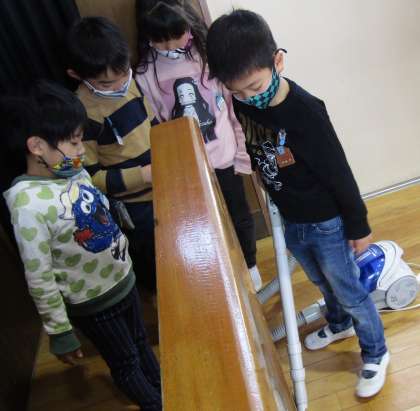 自分が取り組んだお手伝いについて、実演を交えながら発表している様子です。