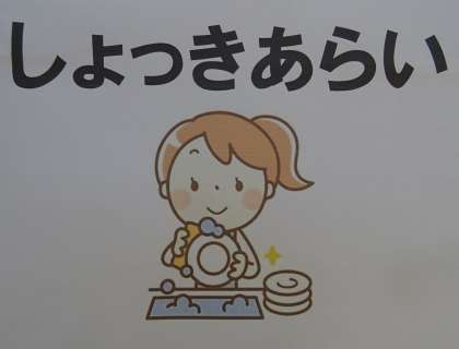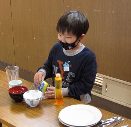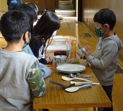 自分が取り組んだお手伝いについて、実演を交えながら発表している様子です。