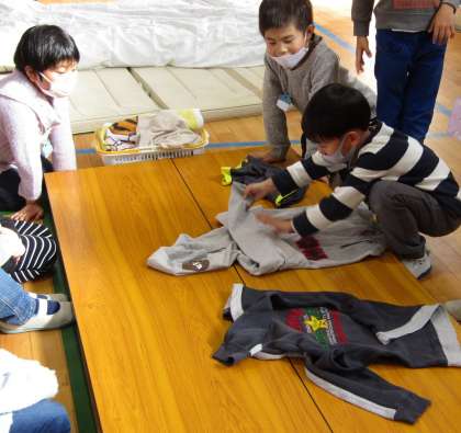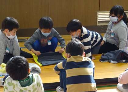 自分が取り組んだお手伝いについて、実演を交えながら発表している様子です。