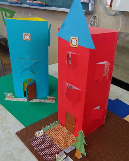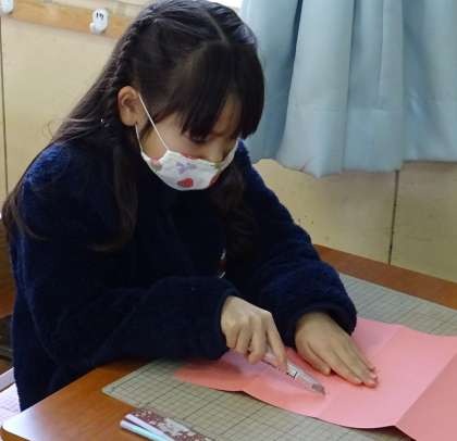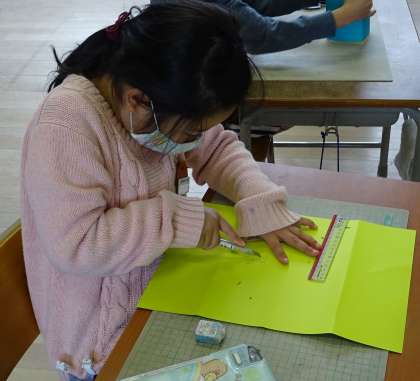 紙をカッターで切って、ドアや窓が開くお家を作ります。