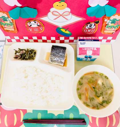 水菜の煮びたしは、水菜と豚肉を合わせて煮ています。子どもたちが食べやすい食感と味付けになるよう調理されていました。