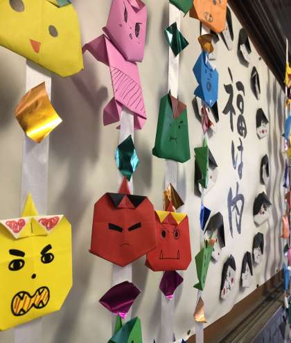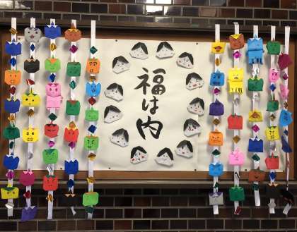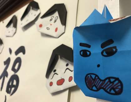 4年生の子どもたちが作ったオニがずらりと並んでいます。