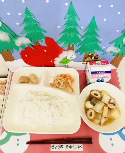 関東煮には、鶏肉、大根、こんにゃく、厚揚げ、ちくわ、じゃがいも、うずら卵が入っています。色々な具材の美味しさが味わえる献立で、子どもたちに大好評でした。