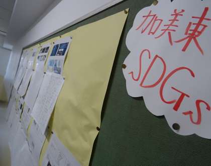 6年生の掲示版には、SDGsについて学んで作成した発表資料が貼られています。