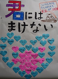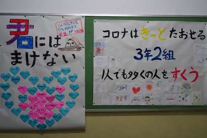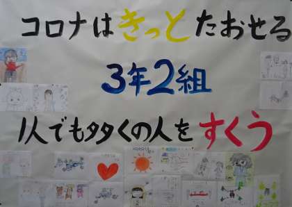 コロナに立ち向かう心❤や、感染予防を呼びかけるイラストが掲示されています。