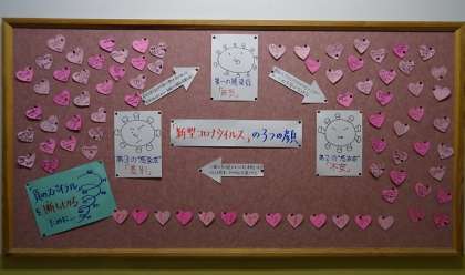 道徳の授業で学習した「コロナに立ち向かうために大切なこと」を、メッセージカードに書いて貼りました。