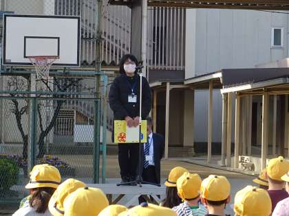 図書ボランティアさんからは、「今年度は新型コロナウイルスの影響で、図書ボランティアもしばらく活動ができず、とても寂しかったです。皆さんぜひ図書室に来て、次々と入荷される新しい本を手に取って読んでくださいね。図書室で待っています。」と、ごあいさつをいただきました。