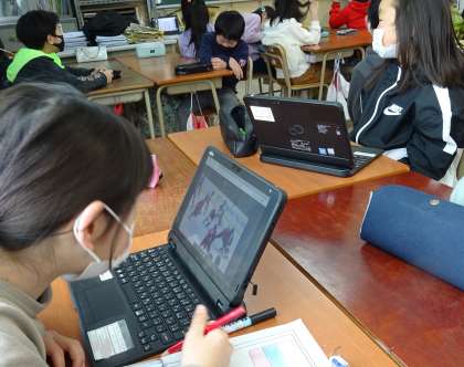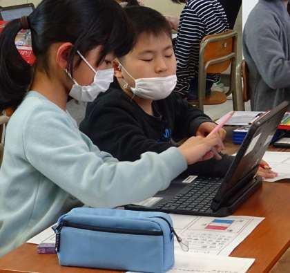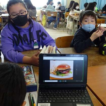 子どもたちは、一人一台のパソコンを使って、世界中にある国の特徴や文化などを調べました。
