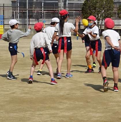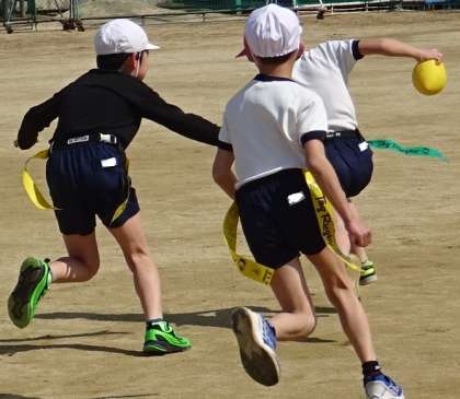 体育の授業でタグラグビーをしている様子です。