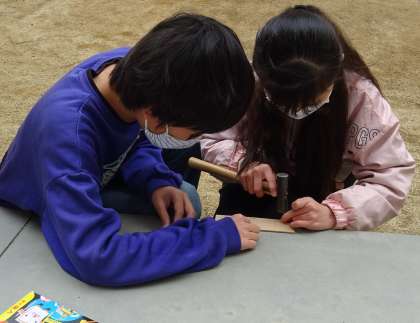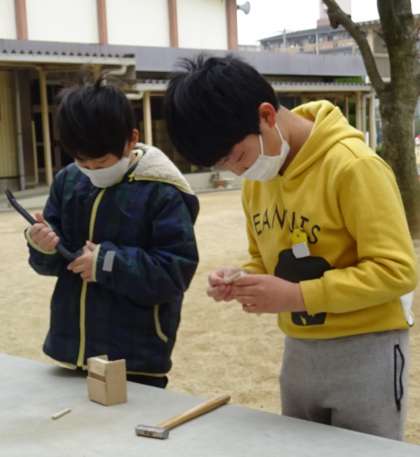 図工の授業で、のこぎりと金づちを使った作品づくりに取り組んでいる様子です。
