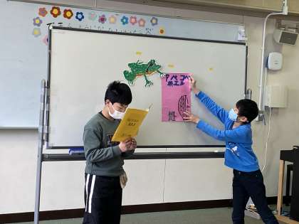 リコーダー・落語劇「んまわし」・かえるの調べ学習の発表です。