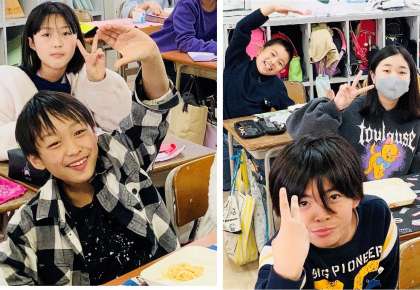教室のあちこちで「おいしいなぁ!」と喜んでくれている中、みんなで「おいしいポーズ」を考えて見せてくれました。