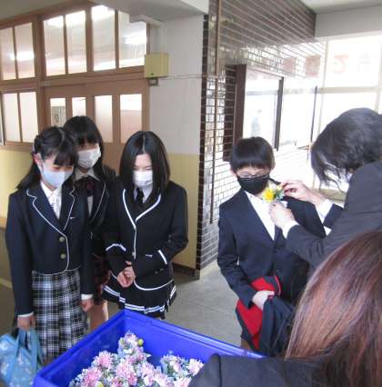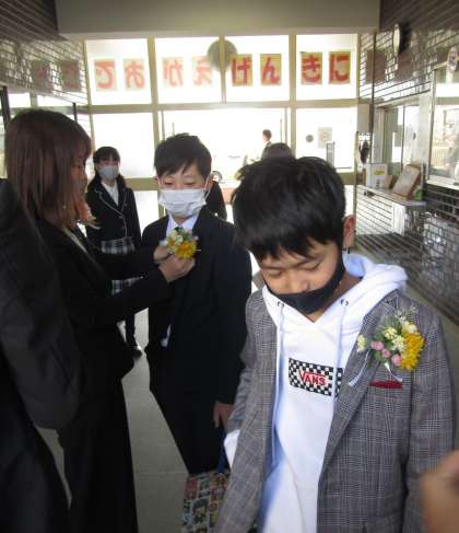 受付で先生に胸花をつけてもらっている様子です。