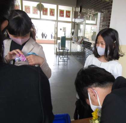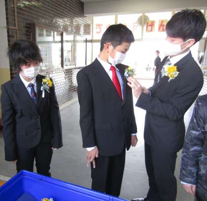 受付で先生に胸花をつけてもらっている様子です。