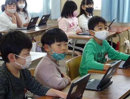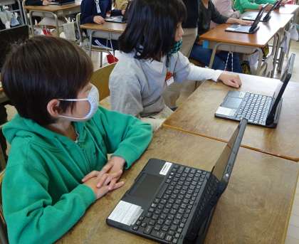 先生の説明を聞いて、パソコンの操作に取り組んでいる様子です。